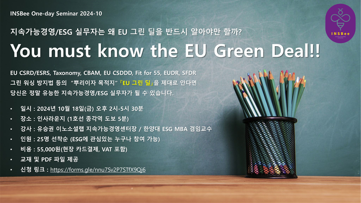 기업 실무자 뿐만 아니라 지속가능경영, ESG에 관심 있는 분이라면 누구나 참석 가능한 오픈 세미나입니다. 현재 글로벌 지속가능경영, ESG를 이끌어가고 있는 유럽연합(EU), 그리고 EU의 지속가능경영의 "뿌리이자 목적지"인 "EU 그린딜", EU 그린딜을 알면 현재 진행 중인 ESG 규제의 목적과 어떻게 대응해야 할 지에 대해 이해할 수 있습니다. 공부하기 좋은 가을... 분위기 좋은 인사동에서 EU 그린 딜에 대해 함께 알아 보시죠.