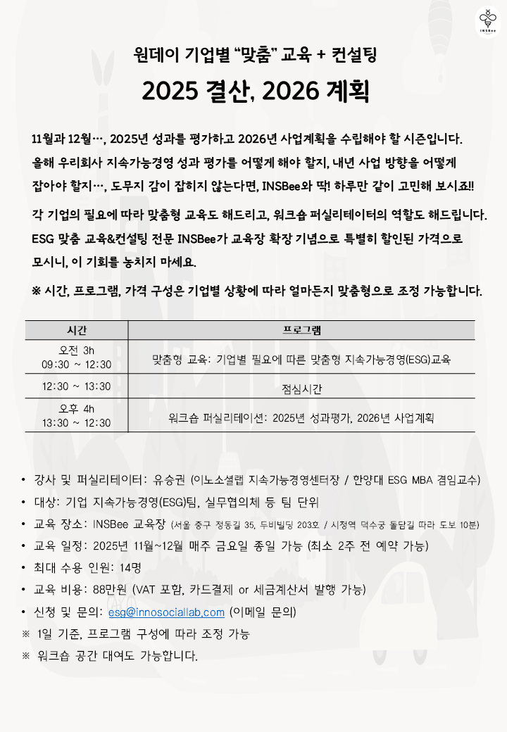 11월과 12월…, 2025년 성과를 평가하고 2026년 사업계획을 수립해야 할 시즌입니다. 올해 우리회사 지속가능경영성과 평가를 어떻게 해야 할지, 내년 사업 방향을 어떻게 잡아야 할지…, 도무지 감이 잡히지 않는다면, 인스비와 딱! 하루만 같이 고민해 보시죠!! 각 기업의 필요에 따라 맞춤형 교육도 해드리고, 워크숍 퍼실리테이터의 역할도 해드립니다. ESG 맞춤 교육&컨설팅 전문 인스비가 교육장 확장 기념으로 특별히 할인된 가격으로 모시니, 이 기회를 놓치지 마세요.