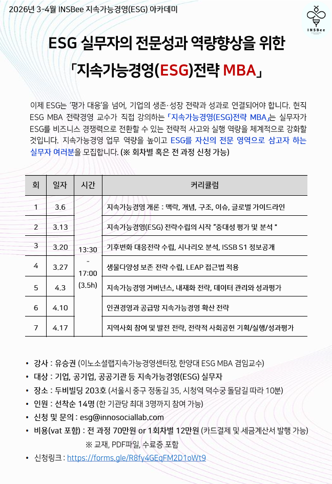 이제 ESG는 ‘평가 대응’을 넘어, 기업의 생존·성장 전략과 성과로 연결되어야 합니다. 현직 ESG MBA 전략경영 교수가 직접 강의하는 「지속가능경영(ESG)전략 MBA」는 실무자가 ESG를 비즈니스 경쟁력으로 전환할 수 있는 전략적 사고와 실행 역량을 체계적으로 강화할 것입니다. 지속가능경영 업무 역량을 높이고 ESG를 자신의 전문 영역으로 삼고자 하는 실무자 여러분을 모집합니다.
