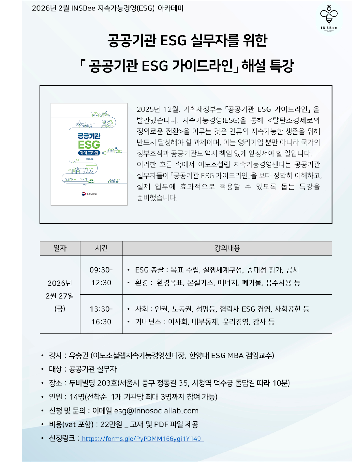 INSBee(이노소셜랩 지속가능경영센터)는 지속가능경영/ESG 분야 실무자들이 ‘제대로 된 지속가능경영’을 실행할 수 있도록 돕는 지속가능경영 컨설팅 & 교육 기업입니다. *<INSBee 지속가능경영